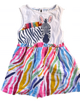 Bring on the color! This fun and fearless Mini Boden girls' safari dress features a sleeveless white top with a bold zebra appliqué and a rainbow mane, paired with a vibrant multicolored skirt covered in wild zebra-inspired stripes. Full of energy and ready for adventure, it’s the perfect outfit for summer fun, birthdays, or standing out in the crowd.