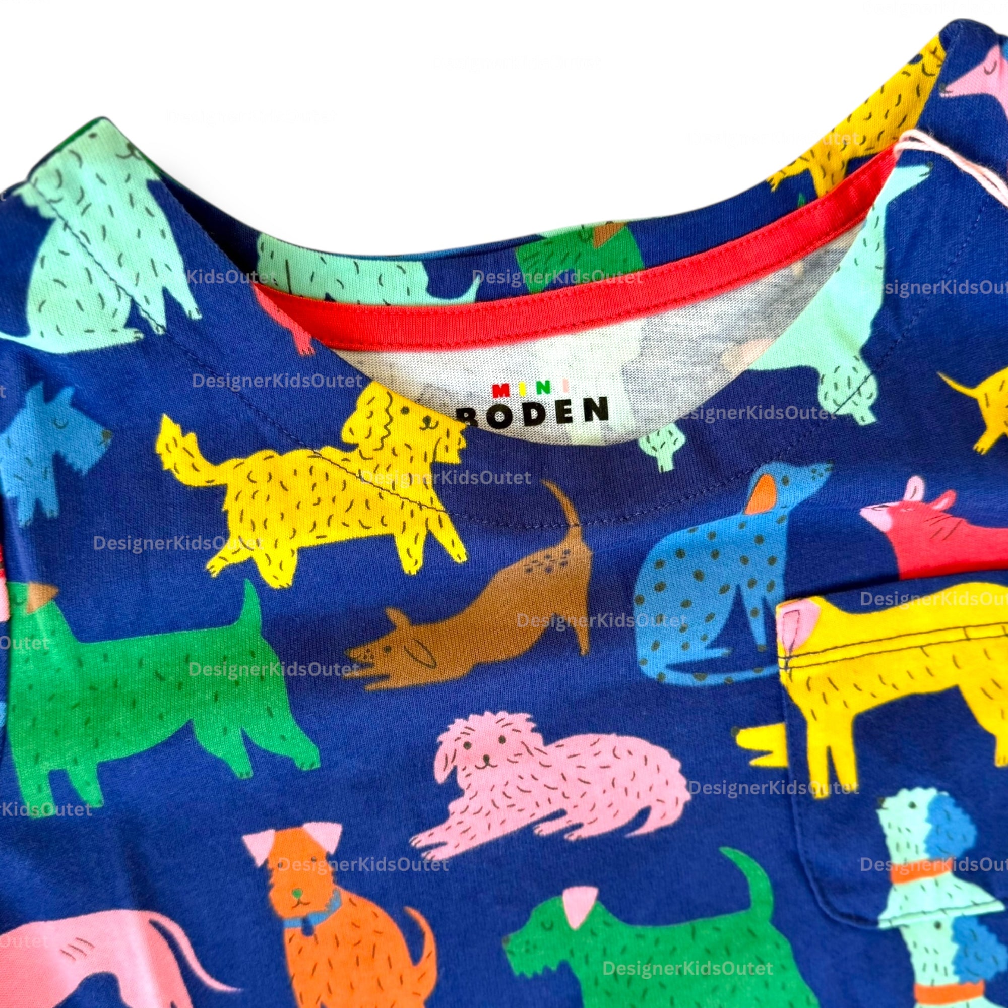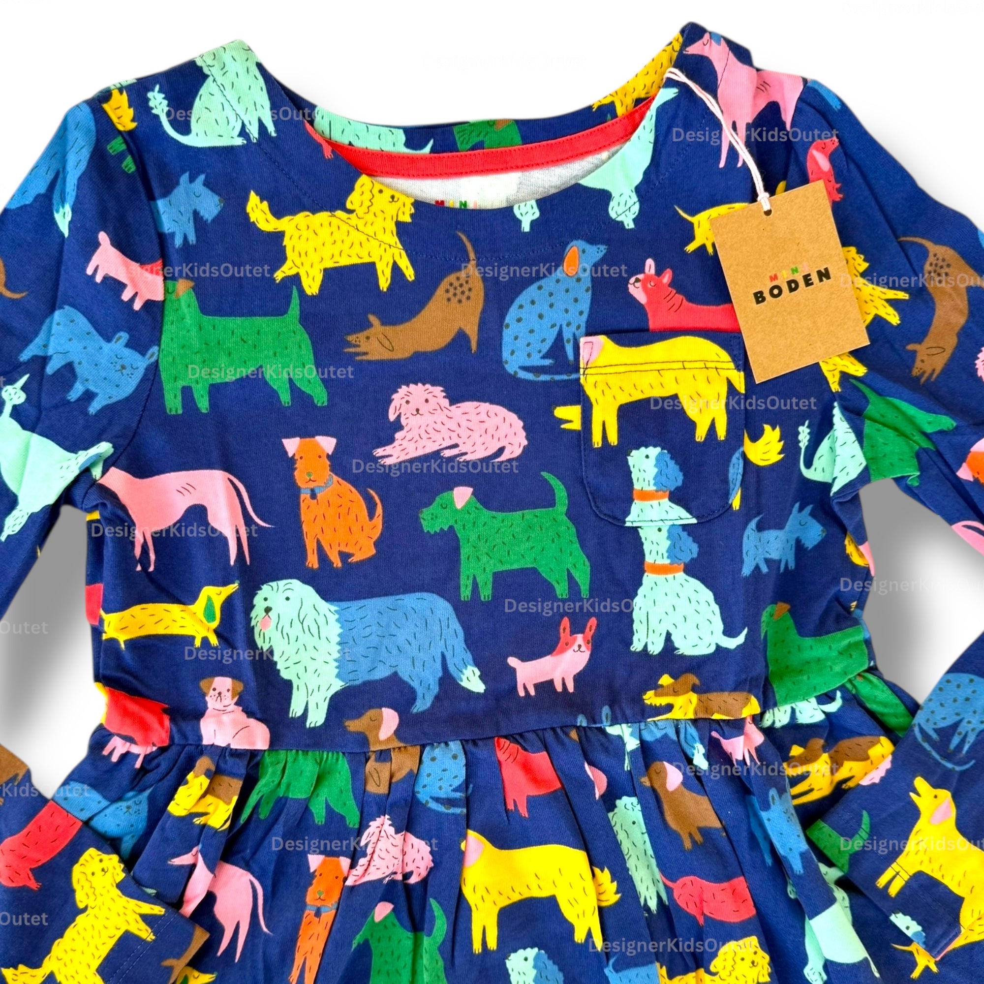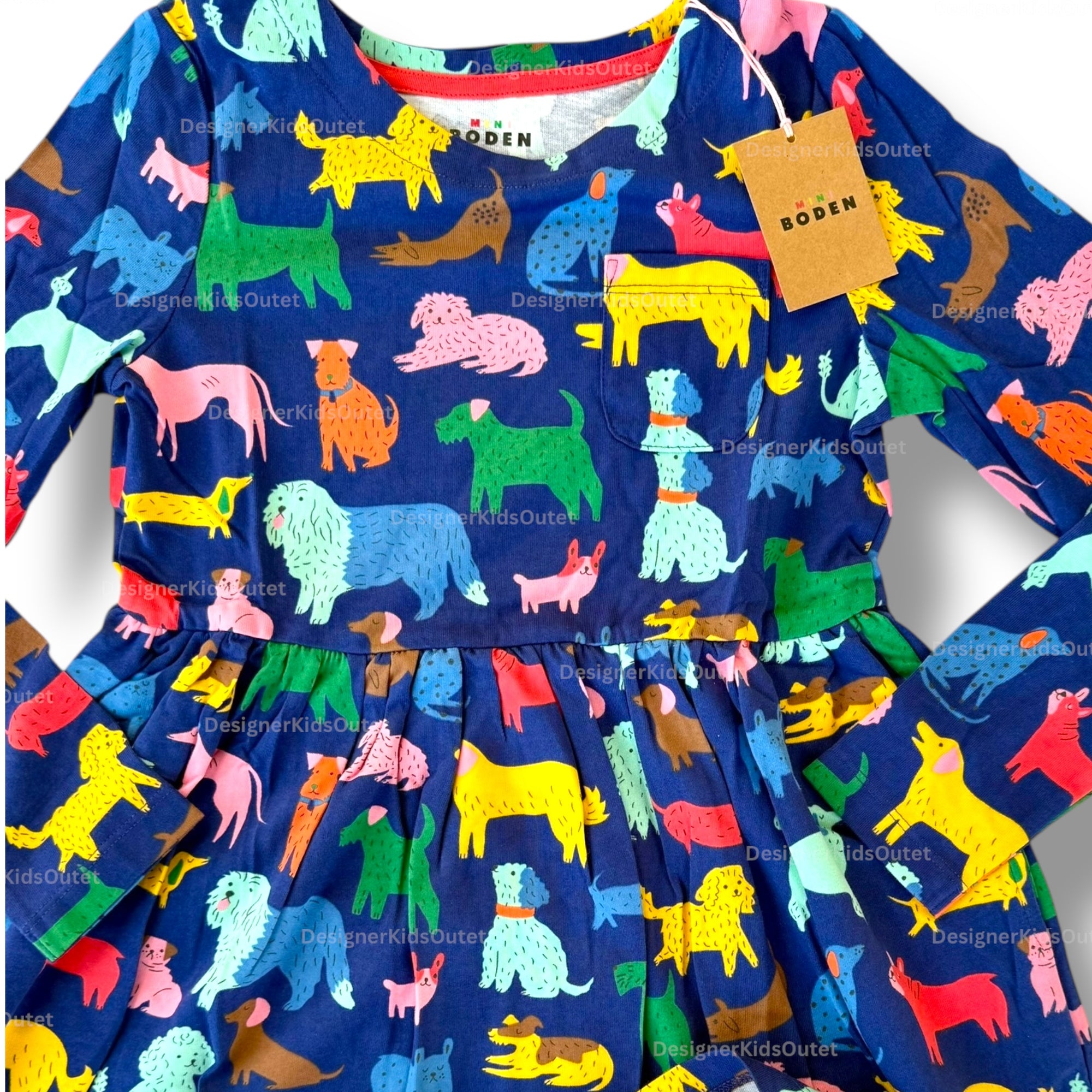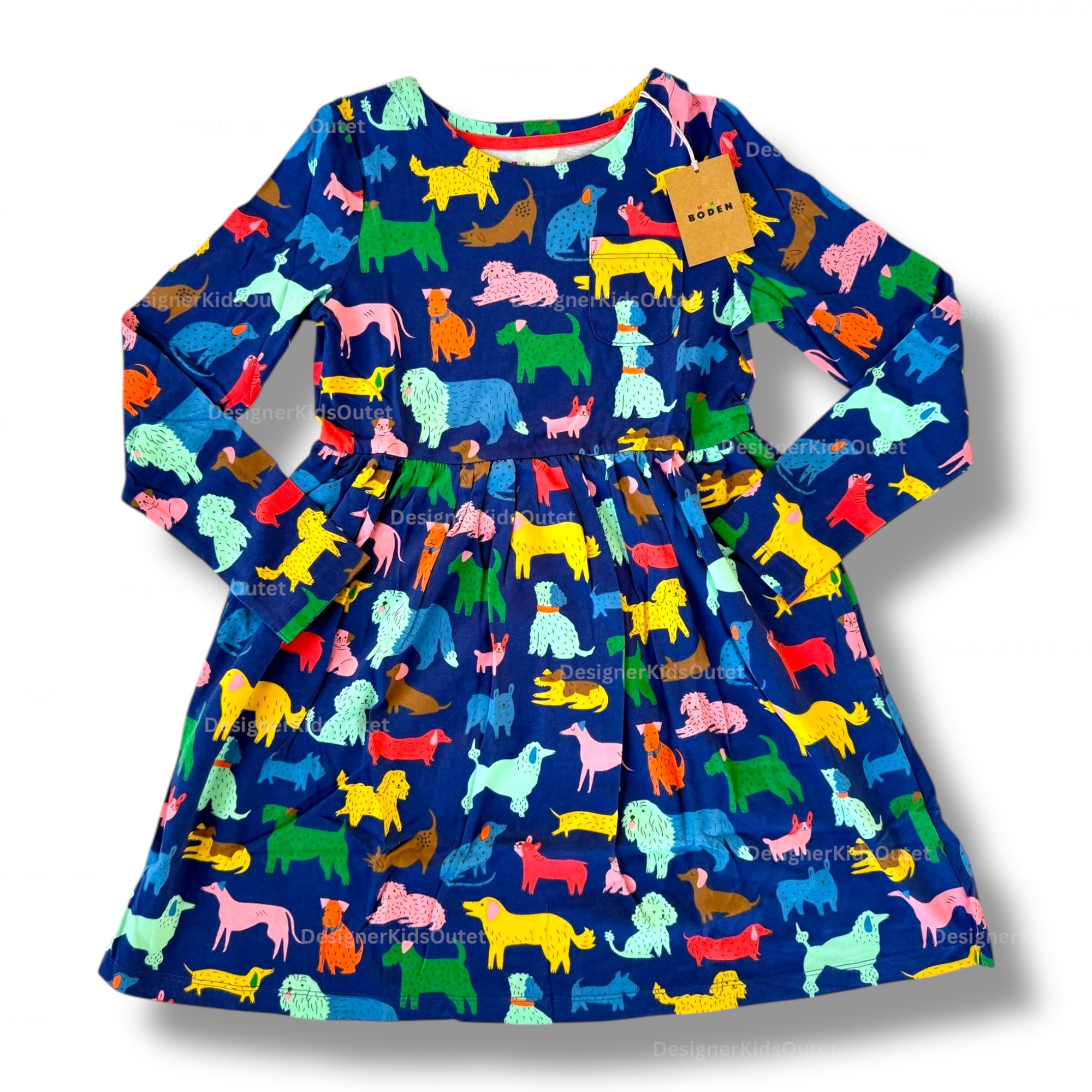 Mini Boden Girls Long Sleeve Dog Print Jersey Dress – Navy & Rainbow