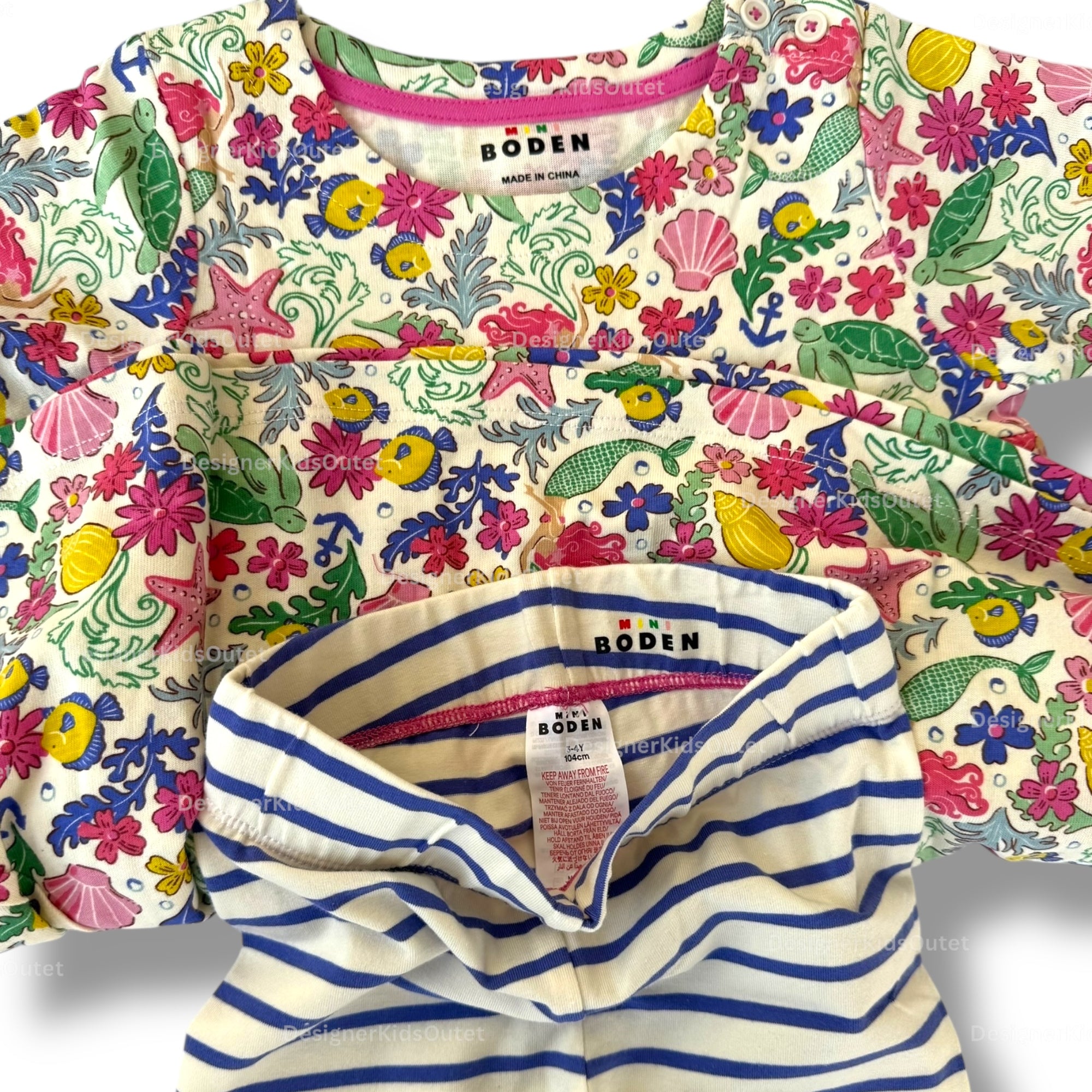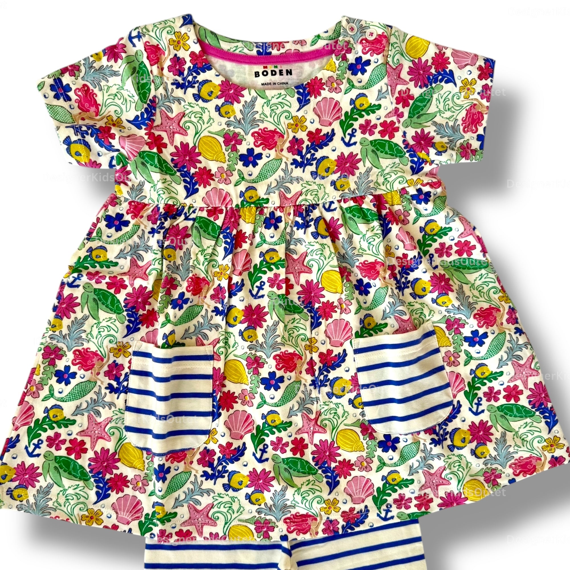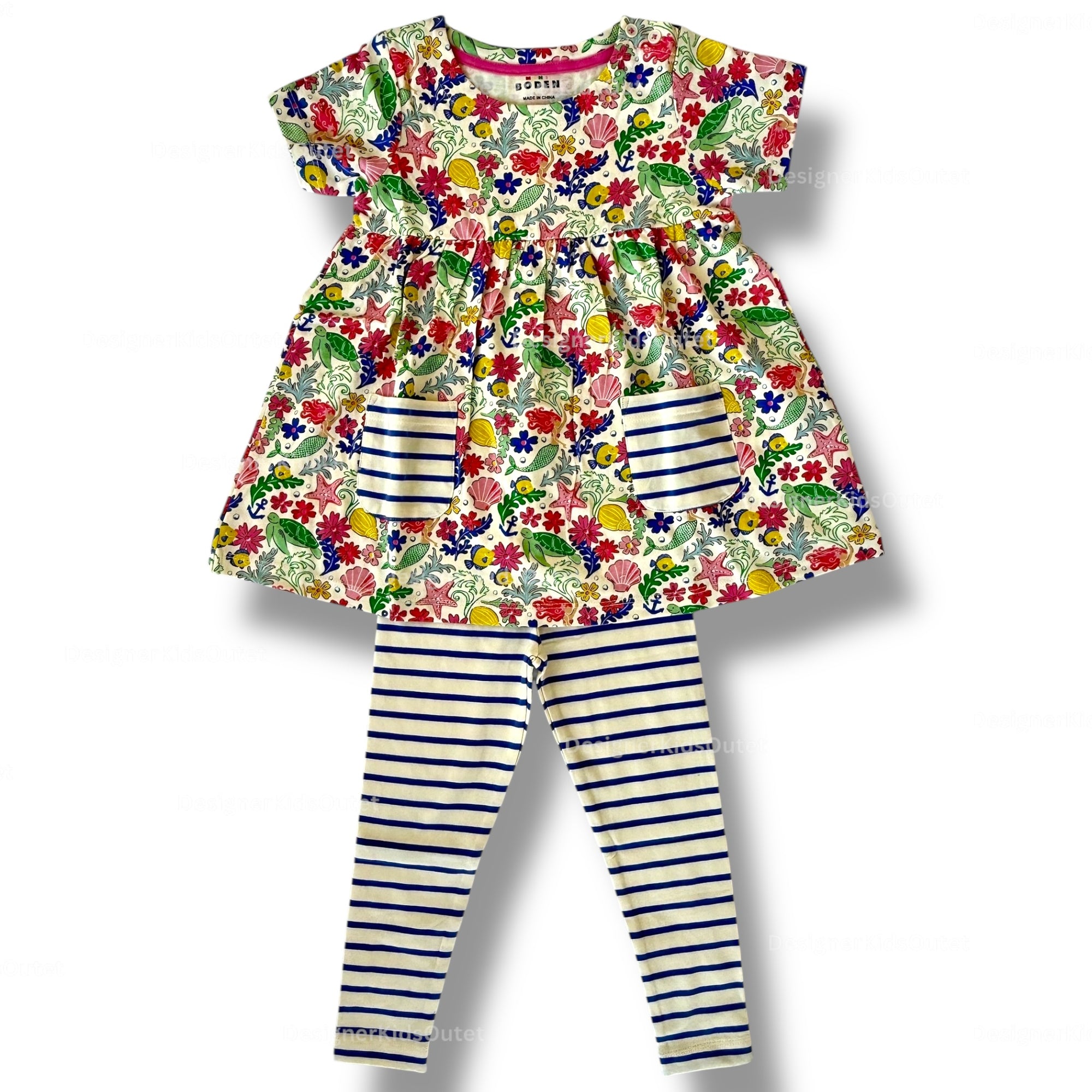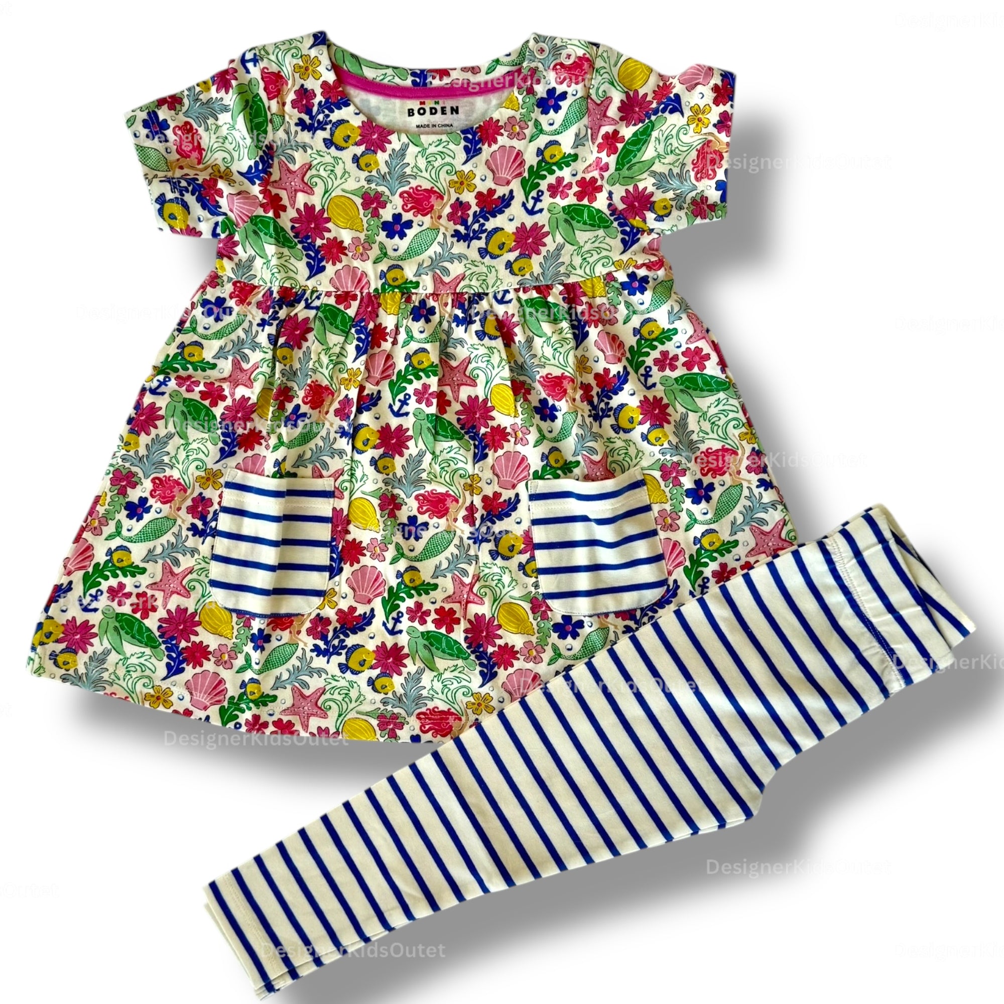 Mini Boden Girls Colorful Smocked Dress with Striped Leggings – Colorful Sea Garden